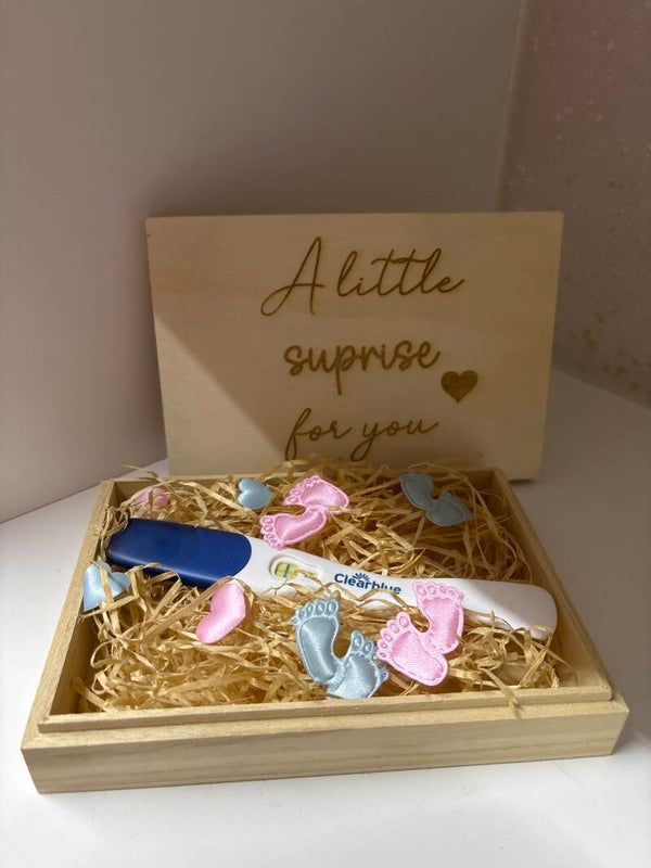 Doosje hout met een zwangerschapstest in hout