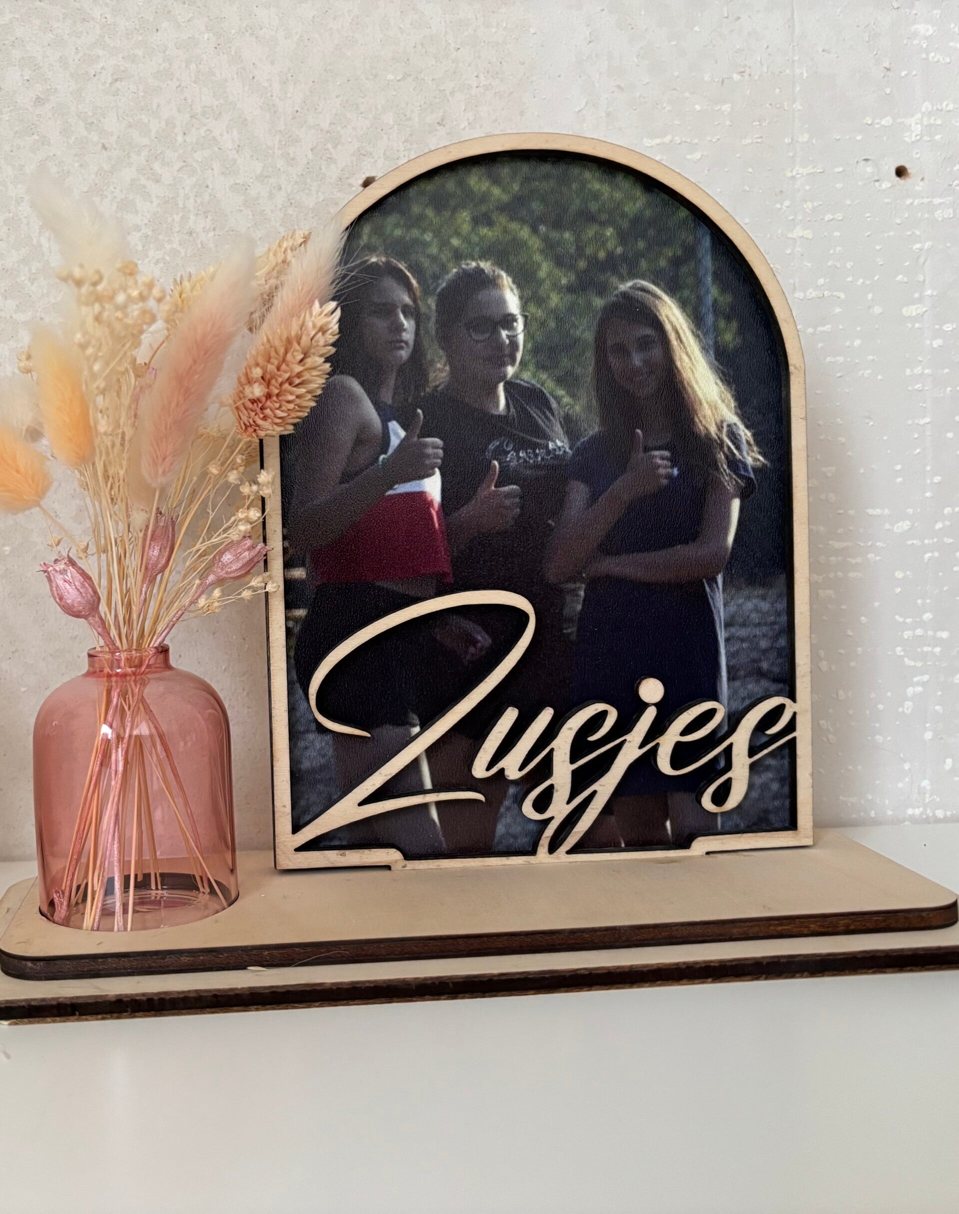 Foto met houten kadertje zusjes