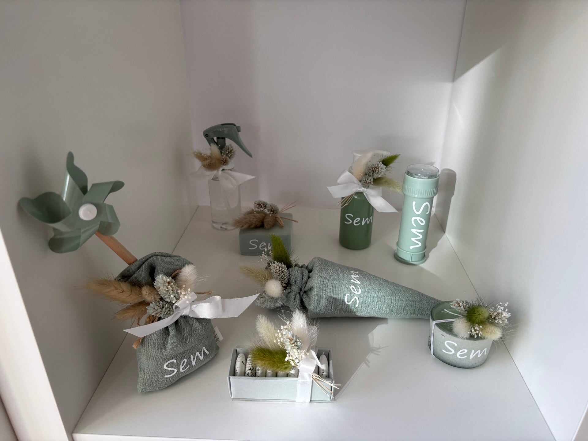 Wil je graag de naam laten borduren op de zakjes en of cono's vraag dan naar de prijzen