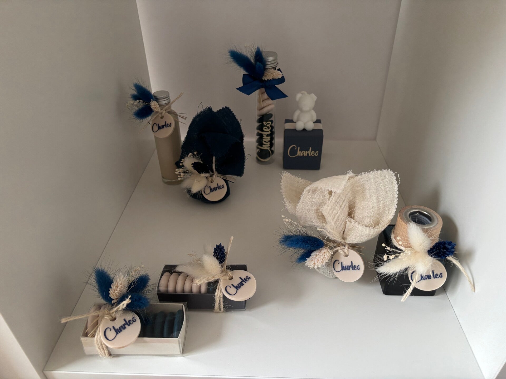 geurflesje blauw met geurstokjes naturel en huisparfum naar keuze afgewerkt met een lintje en droogbloemen ( minimum 6 stuks )